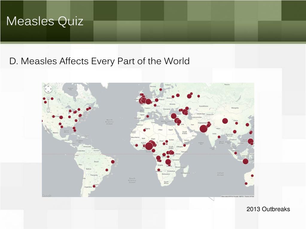 Measles Quiz D. Measles Affects Every Part of the World 2013 Outbreaks