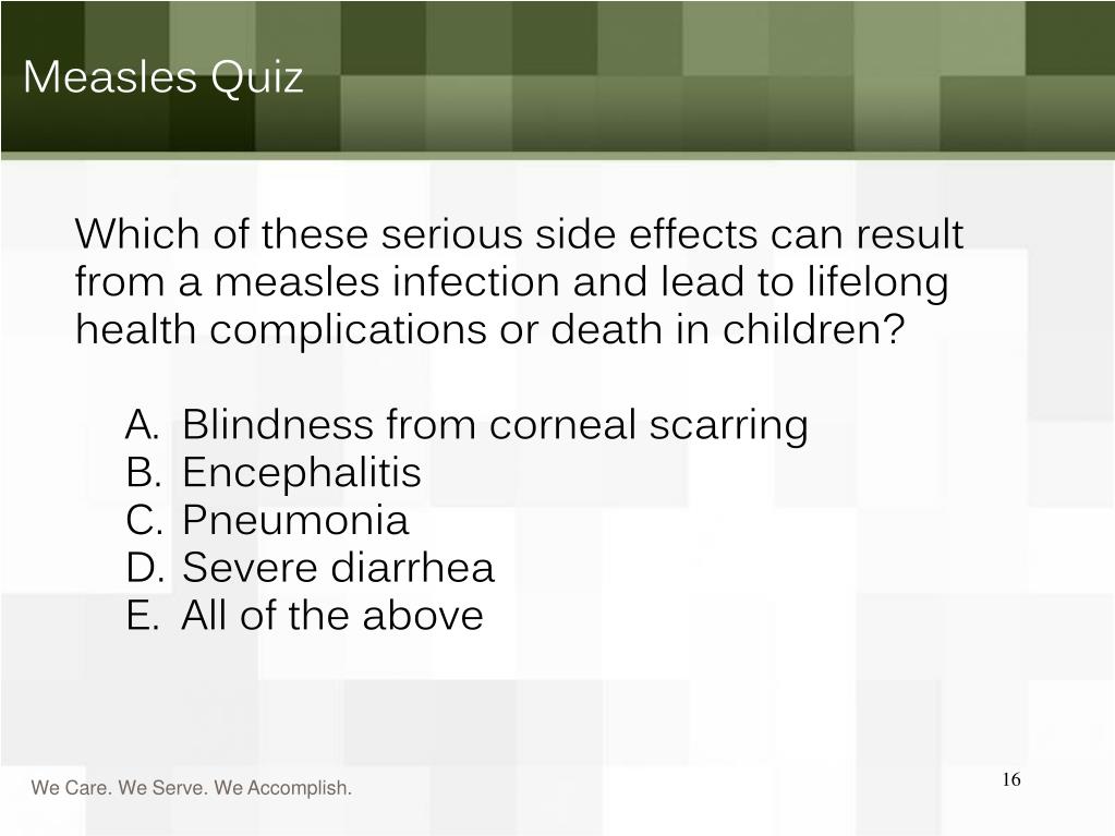 Measles Quiz • Which of these serious side effects can result from a measles infection and lead to lifelong health complications or death in children? • Blindness from corneal scarring • Encephalitis • Pneumonia • Severe diarrhea • All of the above We Care. We Serve. We Accomplish.