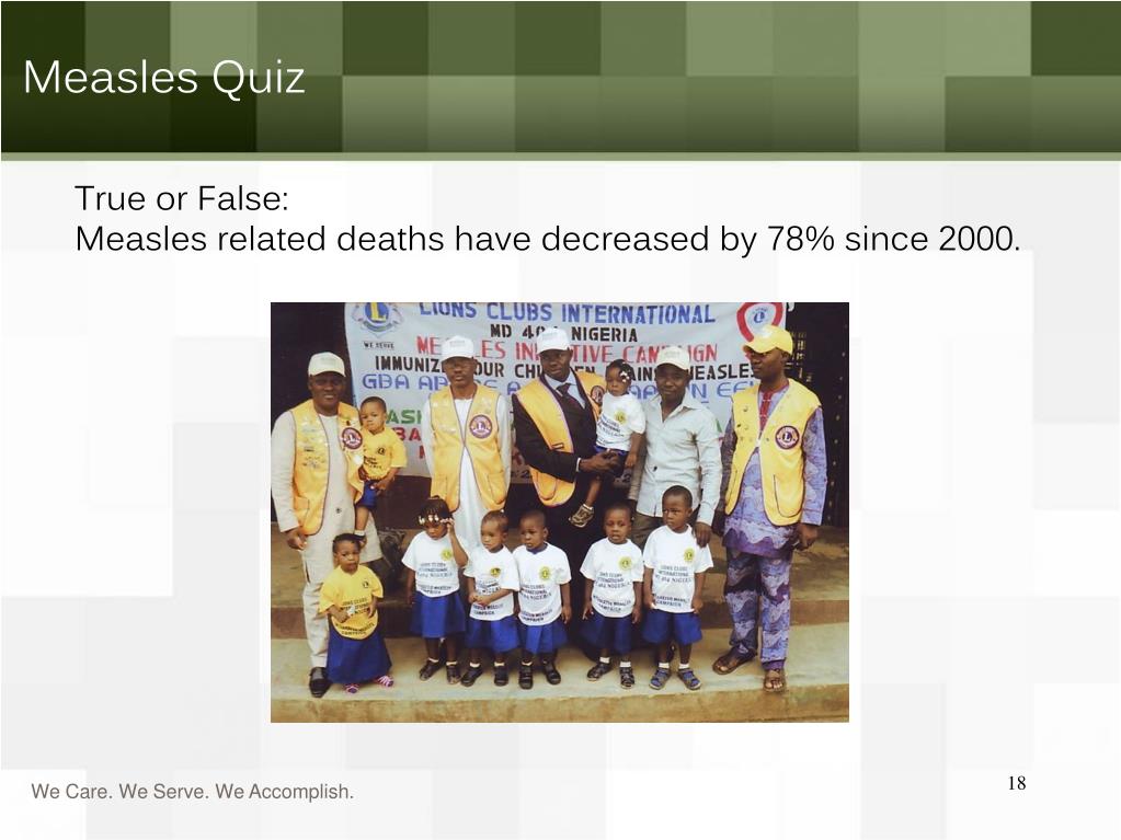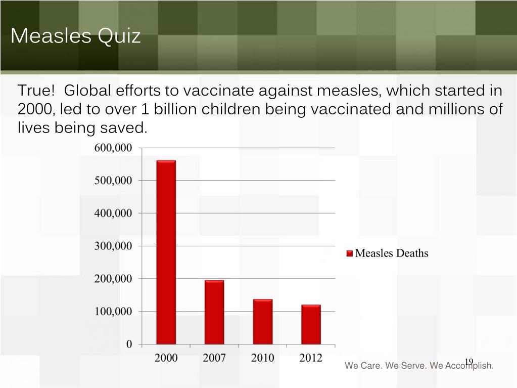 Measles Quiz True or False: Measlesrelateddeathshavedecreasedby 78% since 2000. We Care. We Serve. We Accomplish.