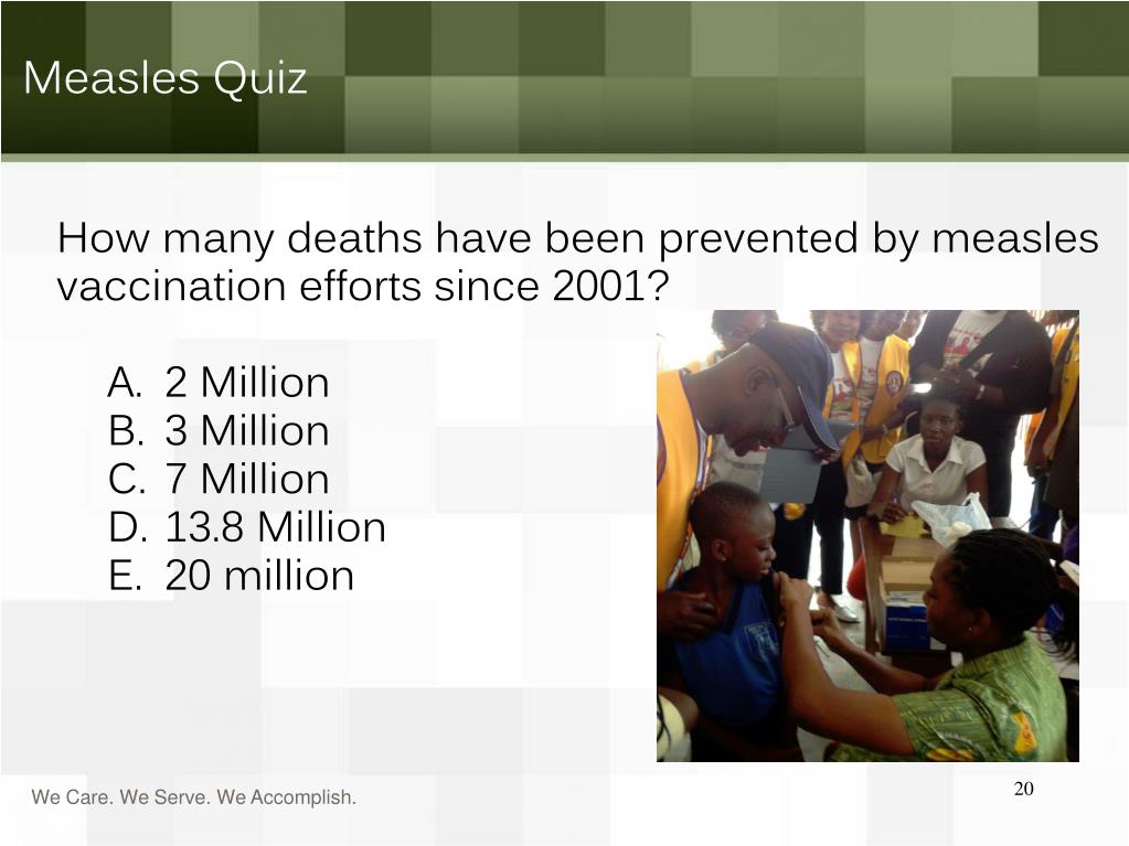 Measles Quiz How many deaths have been prevented by measles vaccination efforts since 2001? • 2 Million • 3 Million • 7 Million • 13.8 Million • 20 million We Care. We Serve. We Accomplish.