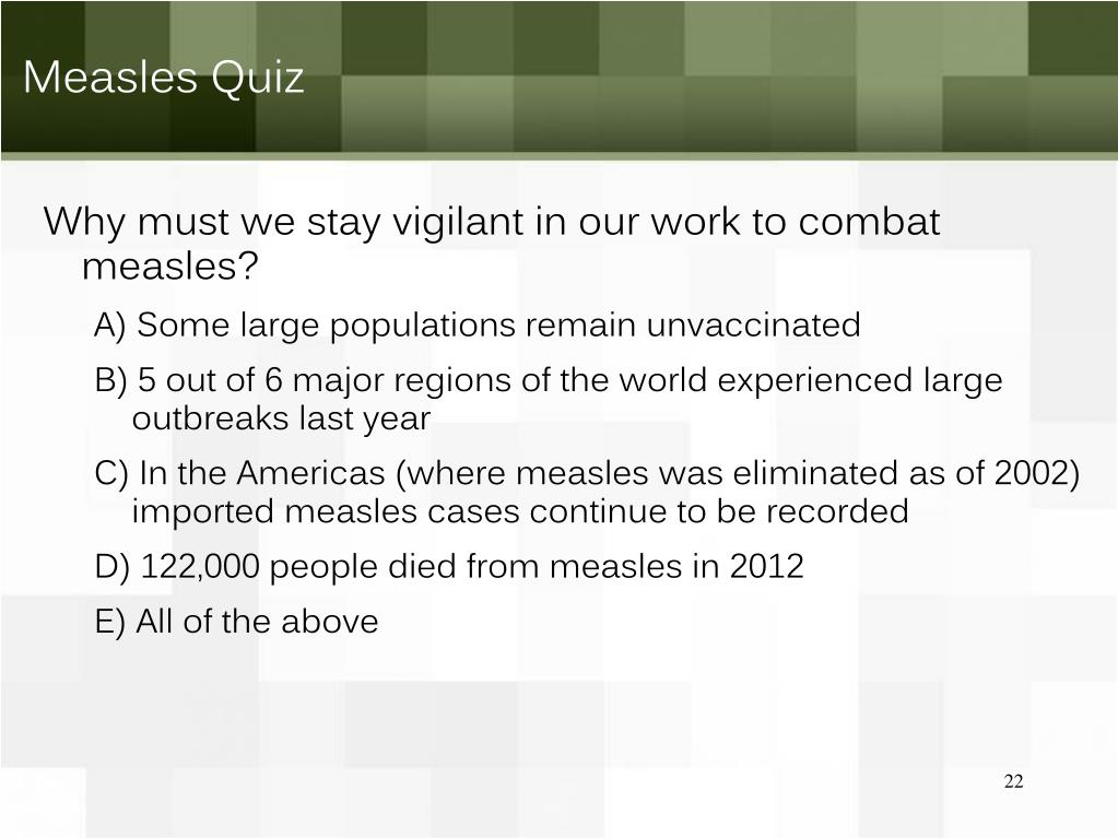 Measles Quiz Why must we stay vigilant in our work to combat measles? A) Some large populations remain unvaccinated B) 5 out of 6 major regions of the world experienced large outbreaks last year C) In the Americas (where measles was eliminated as of 2002) imported measles cases continue to be recorded D) 122,000 people died from measles in 2012 E) All of the above