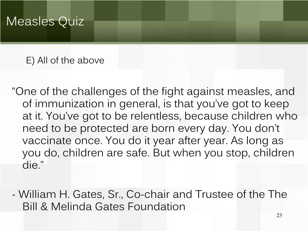 Measles Quiz E) All of the above “One of the challenges of the fight against measles, and of immunization in general, is that you’ve got to keep at it. You’ve got to be relentless, because children who need to be protected are born every day. You don’t vaccinate once. You do it year after year. As long as you do, children are safe. But when you stop, children die.” - William H. Gates, Sr., Co-chair and Trustee of the The Bill & Melinda Gates Foundation