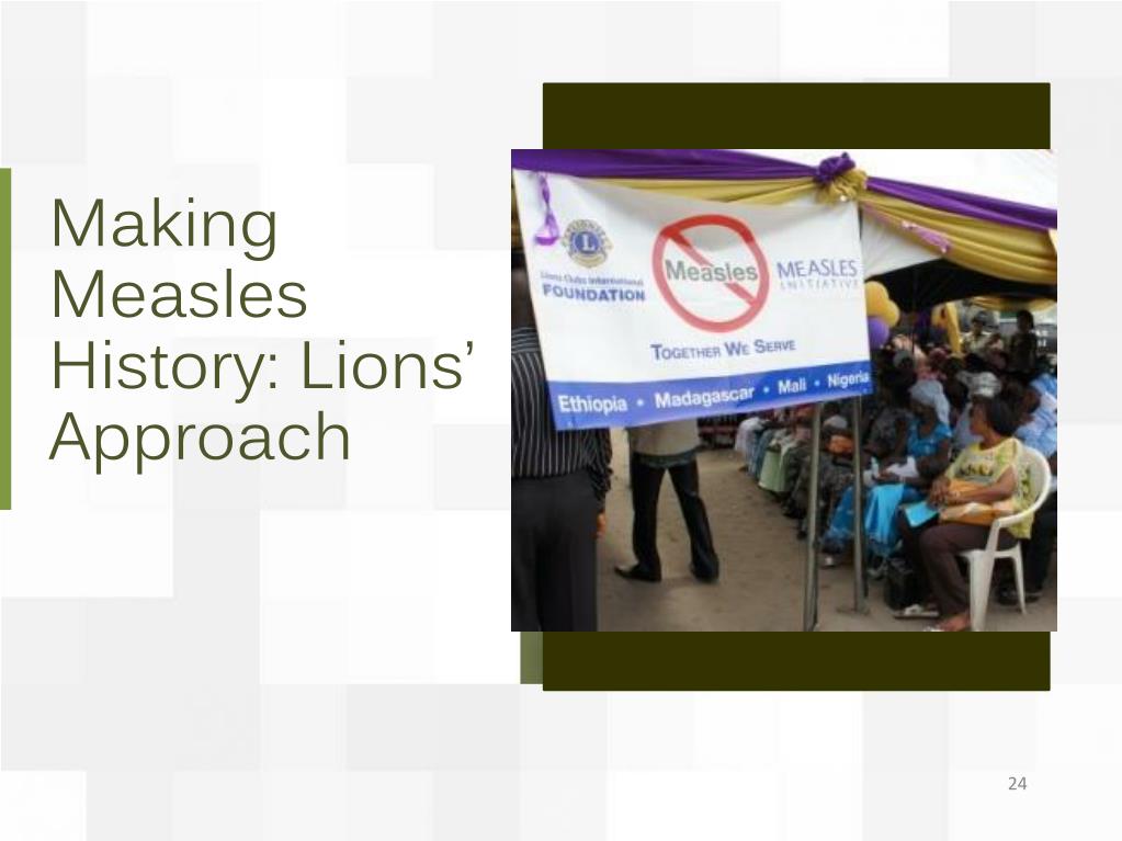 New partnership with GAVI Alliance • US$30 million by 2017 • 1:1 match under GAVI Matching Fund • Continuation of Lions efforts to make measles history A New Challenge US$60M GAVI MatchingFundPartners