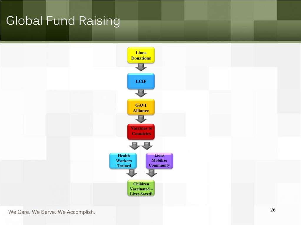 Global Fund Raising Lions Donations LCIF GAVI Alliance Vaccines to Countries Lions Mobilize Community Health Workers Trained Children Vaccinated – Lives Saved! We Care. We Serve. We Accomplish.