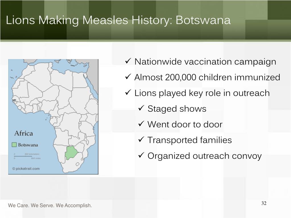Lions Making Measles History: Botswana • Nationwide vaccination campaign • Almost 200,000 children immunized • Lions played key role in outreach • Staged shows • Went door to door • Transported families • Organized outreach convoy We Care. We Serve. We Accomplish.