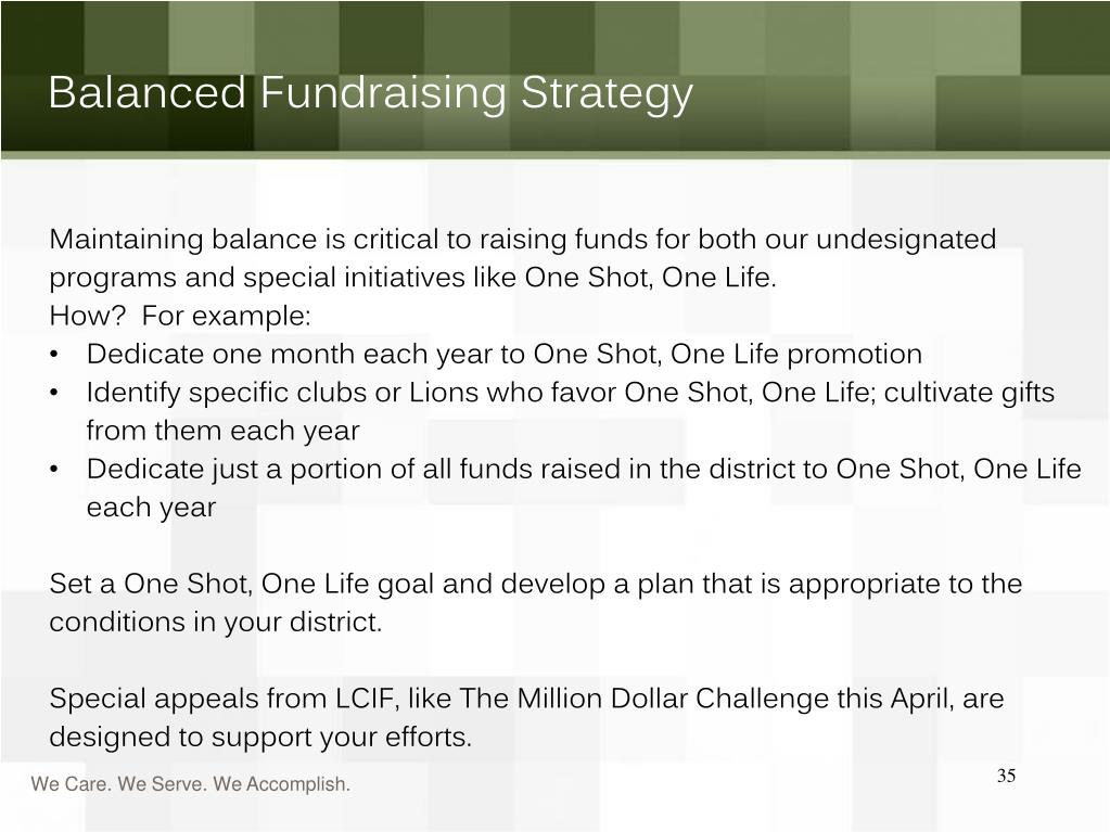 Balanced Fundraising Strategy • Maintaining balance is critical to raising funds for both our undesignated programs and special initiatives like One Shot, One Life. • How? For example: • Dedicate one month each year to One Shot, One Life promotion • Identify specific clubs or Lions who favor One Shot, One Life; cultivate gifts from them each year • Dedicate just a portion of all funds raised in the district to One Shot, One Life each year • Set a One Shot, One Life goal and develop a plan that is appropriate to the conditions in your district. • Special appeals from LCIF, like The Million Dollar Challenge this April, are designed to support your efforts. We Care. We Serve. We Accomplish.