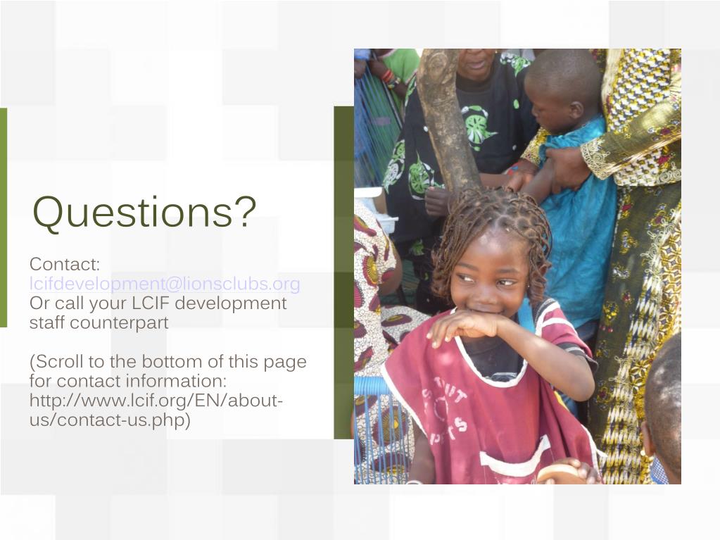 Questions? Contact: lcifdevelopment@lionsclubs.org Or call your LCIF development staff counterpart (Scroll to the bottom of this page for contact information: http://www.lcif.org/EN/about-us/contact-us.php)