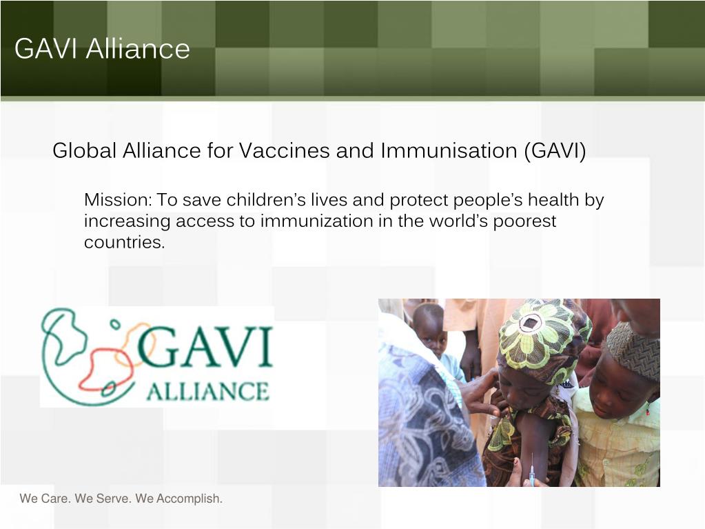 GAVI Alliance • Global Alliance for Vaccines and Immunisation (GAVI) • Mission: To save children’s lives and protect people’s health by increasing access to immunization in the world’s poorest countries. We Care. We Serve. We Accomplish.