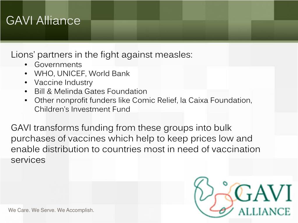 GAVI Alliance • Lions’ partners in the fight against measles: • Governments • WHO, UNICEF, World Bank • Vaccine Industry • Bill & Melinda Gates Foundation • Other nonprofit funders like Comic Relief, la Caixa Foundation, Children’s Investment Fund • GAVI transforms funding from these groups into bulk purchases of vaccines which help to keep prices low and enable distribution to countries most in need of vaccination services We Care. We Serve. We Accomplish.