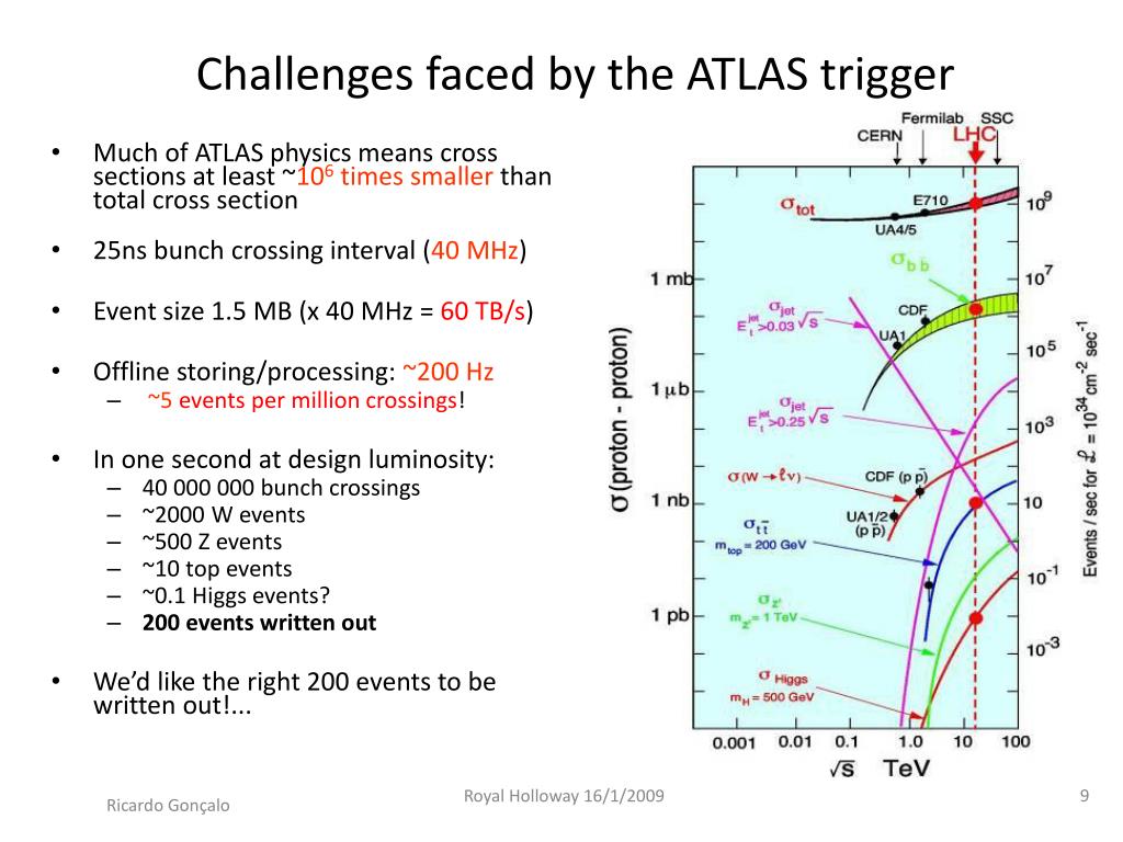 Challenges faced by the ATLAS trigger • Much of ATLAS physics means cross sections at least ~106 times smaller than total cross section • 25ns bunch crossing interval (40 MHz) • Event size 1.5 MB (x 40 MHz = 60 TB/s) • Offline storing/processing: ~200 Hz • ~5 events per million crossings! • In one second at design luminosity: • 40 000 000 bunch crossings • ~2000 W events • ~500 Z events • ~10 top events • ~0.1 Higgs events? • 200 events written out • We’d like the right 200 events to be written out!... Royal Holloway 16/1/2009
