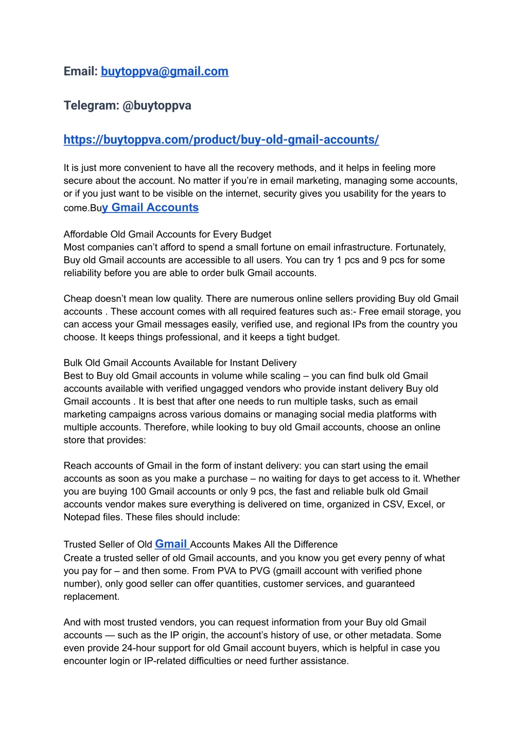 1. Best Websites to Buy Aged Gmail Accounts..2011.25 When you Buy old Gmail accounts, you’re also not paying for just any email account — you’re purchasing veritable and aged Gmail accounts that can provide you with authority and credibility. These are usually utilized by marketers, agencies, businesses, and the like in search of verified emails for social media, email marketing, and account verifications. Buy old Gmail accounts embody some that have a history of being used, which helps them seem authentic to systems and algorithms. From YouTube channels, forums, and across platforms, Aged accounts help users to use a Buy old Gmail accounts without interruptions like bans and verifications.Buy Old Gmail Account If you face any problem you can contact us. we are online 24/7 hours WhatsApp: +1 (607) 382-6431 Email: buytoppva@gmail.com Telegram: @buytoppva https://buytoppva.com/product/buy-old-gmail-accounts/ For other people who are dealing with marketing or managing marketing campaigns or social media and Gmail accounts, buying bulk old Gmail accounts makes sense because it guarantees them easy scaling, consistency, and control – particularly if they are operating in different countries or different time zones. Benefits of Old Gmail Accounts You Should Know