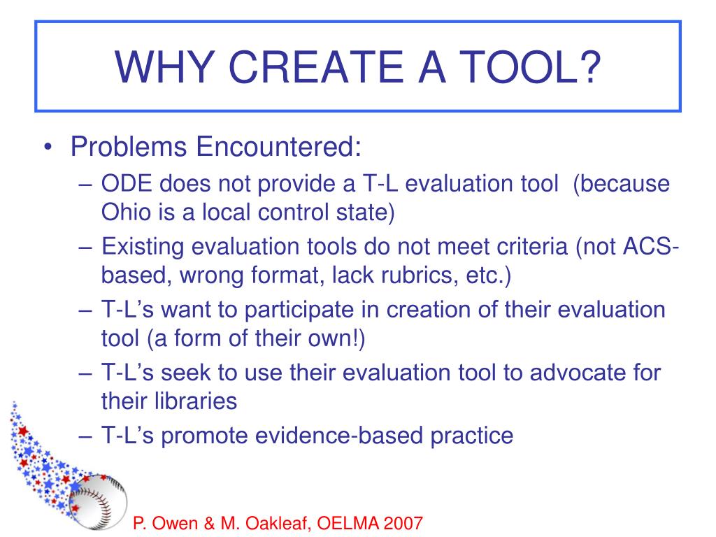 WHY CREATE A TOOL? • Problems Encountered: • ODE does not provide a T-L evaluation tool (because Ohio is a local control state) • Existing evaluation tools do not meet criteria (not ACS-based, wrong format, lack rubrics, etc.) • T-L’s want to participate in creation of their evaluation tool (a form of their own!) • T-L’s seek to use their evaluation tool to advocate for their libraries • T-L’s promote evidence-based practice