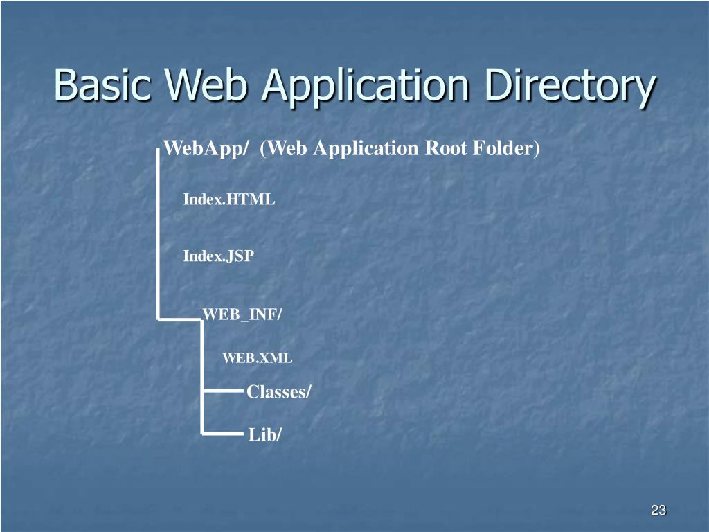 Contents of the WEB-INF directory • /WEB-INF/web.xml deployment descriptor • /WEB-INF/classes/* directory for servlet and utility classes. • /WEB-INF/lib/*.jar area for Java Archive files which contain servlets, beans, and other utility classes useful to the web application.