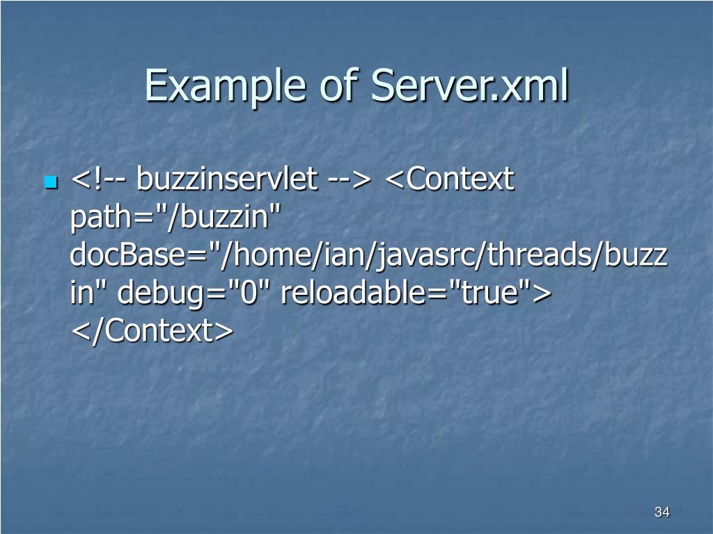 Example of Server.xml • <!-- buzzinservlet --> <Context path="/buzzin" docBase="/home/ian/javasrc/threads/buzzin" debug="0" reloadable="true"> </Context>