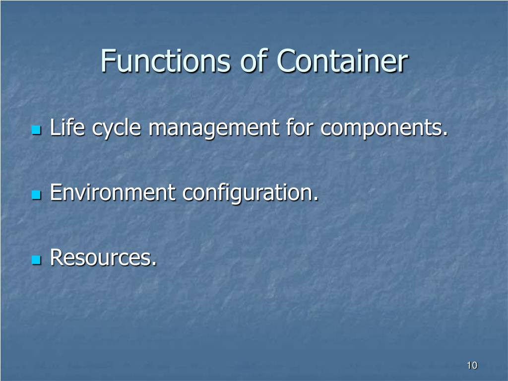 Functions of Container • Life cycle management for components. • Environment configuration. • Resources.