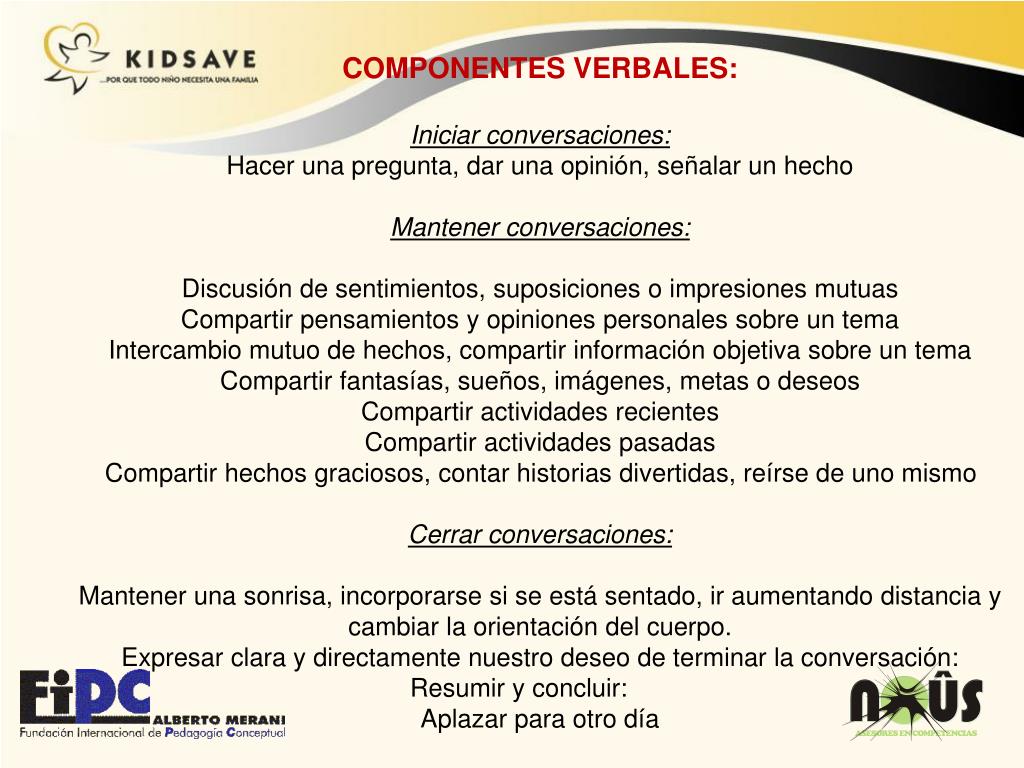 COMPONENTES VERBALES: Iniciar conversaciones: Hacer una pregunta, dar una opinión, señalar un hecho Mantener conversaciones: Discusión de sentimientos, suposiciones o impresiones mutuas Compartir pensamientos y opiniones personales sobre un tema Intercambio mutuo de hechos, compartir información objetiva sobre un tema Compartir fantasías, sueños, imágenes, metas o deseos Compartir actividades recientes Compartir actividades pasadas Compartir hechos graciosos, contar historias divertidas, reírse de uno mismo Cerrar conversaciones: Mantener una sonrisa, incorporarse si se está sentado, ir aumentando distancia y cambiar la orientación del cuerpo. Expresar clara y directamente nuestro deseo de terminar la conversación: Resumir y concluir: Aplazar para otro día