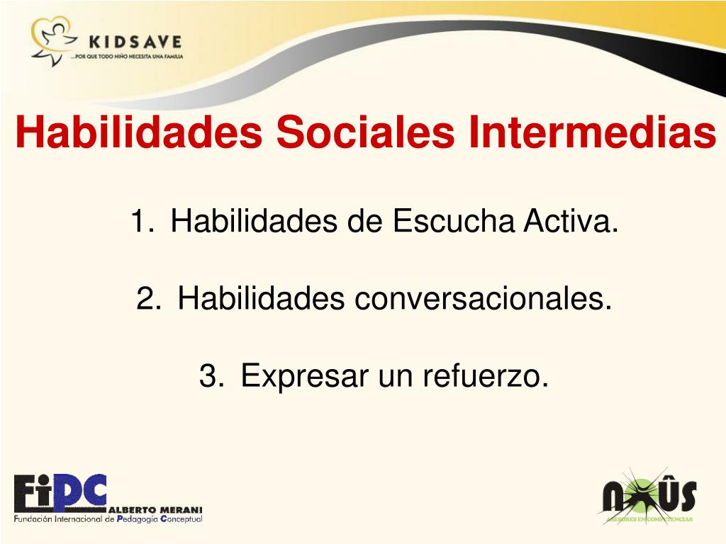 Habilidades Sociales Intermedias • Habilidades de Escucha Activa. • Habilidades conversacionales. • Expresar un refuerzo.