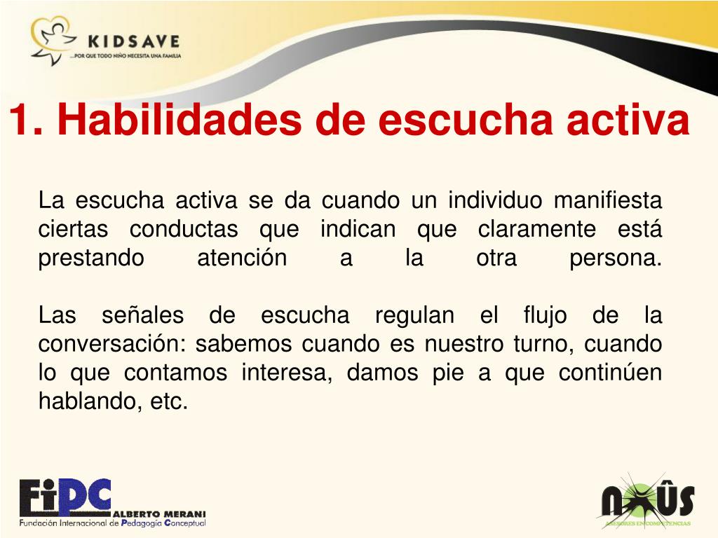 1. Habilidades de escucha activa La escucha activa se da cuando un individuo manifiesta ciertas conductas que indican que claramente está prestando atención a la otra persona. Las señales de escucha regulan el flujo de la conversación: sabemos cuando es nuestro turno, cuando lo que contamos interesa, damos pie a que continúen hablando, etc.