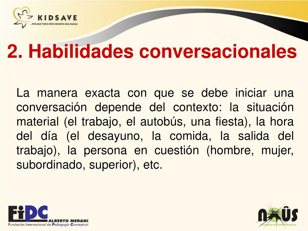 2. Habilidades conversacionales La manera exacta con que se debe iniciar una conversación depende del contexto: la situación material (el trabajo, el autobús, una fiesta), la hora del día (el desayuno, la comida, la salida del trabajo), la persona en cuestión (hombre, mujer, subordinado, superior), etc.