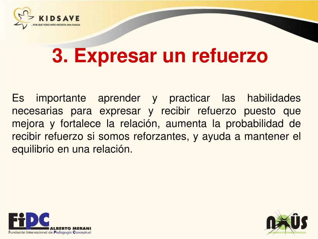 3. Expresar un refuerzo Es importante aprender y practicar las habilidades necesarias para expresar y recibir refuerzo puesto que mejora y fortalece la relación, aumenta la probabilidad de recibir refuerzo si somos reforzantes, y ayuda a mantener el equilibrio en una relación.