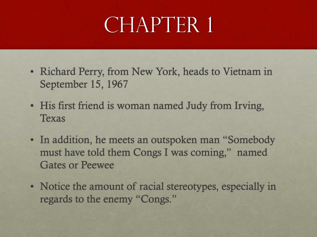 Chapter 1 • Richard Perry, from New York, heads to Vietnam in September 15, 1967 • His first friend is woman named Judy from Irving, Texas • In addition, he meets an outspoken man “Somebody must have told them Congs I was coming,” named Gates or Peewee • Notice the amount of racial stereotypes, especially in regards to the enemy “Congs.”
