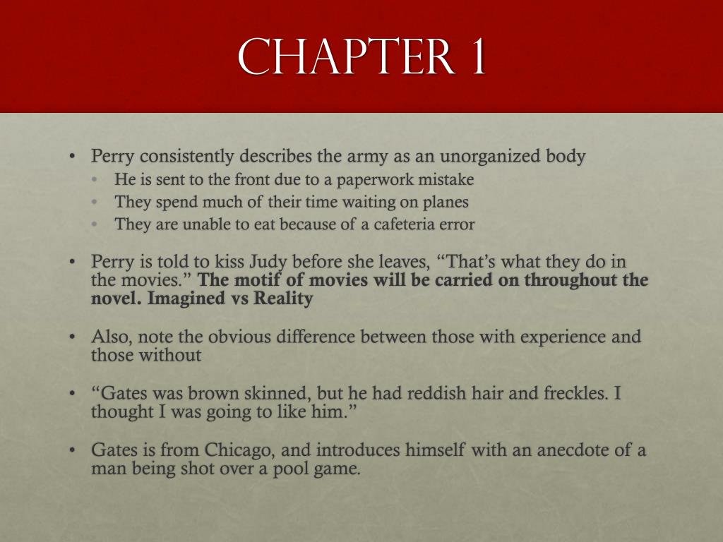 Chapter 1 • Perry consistently describes the army as an unorganized body • He is sent to the front due to a paperwork mistake • They spend much of their time waiting on planes • They are unable to eat because of a cafeteria error • Perry is told to kiss Judy before she leaves, “That’s what they do in the movies.” The motif of movies will be carried on throughout the novel. Imagined vs Reality • Also, note the obvious difference between those with experience and those without • “Gates was brown skinned, but he had reddish hair and freckles. I thought I was going to like him.” • Gates is from Chicago, and introduces himself with an anecdote of a man being shot over a pool game.