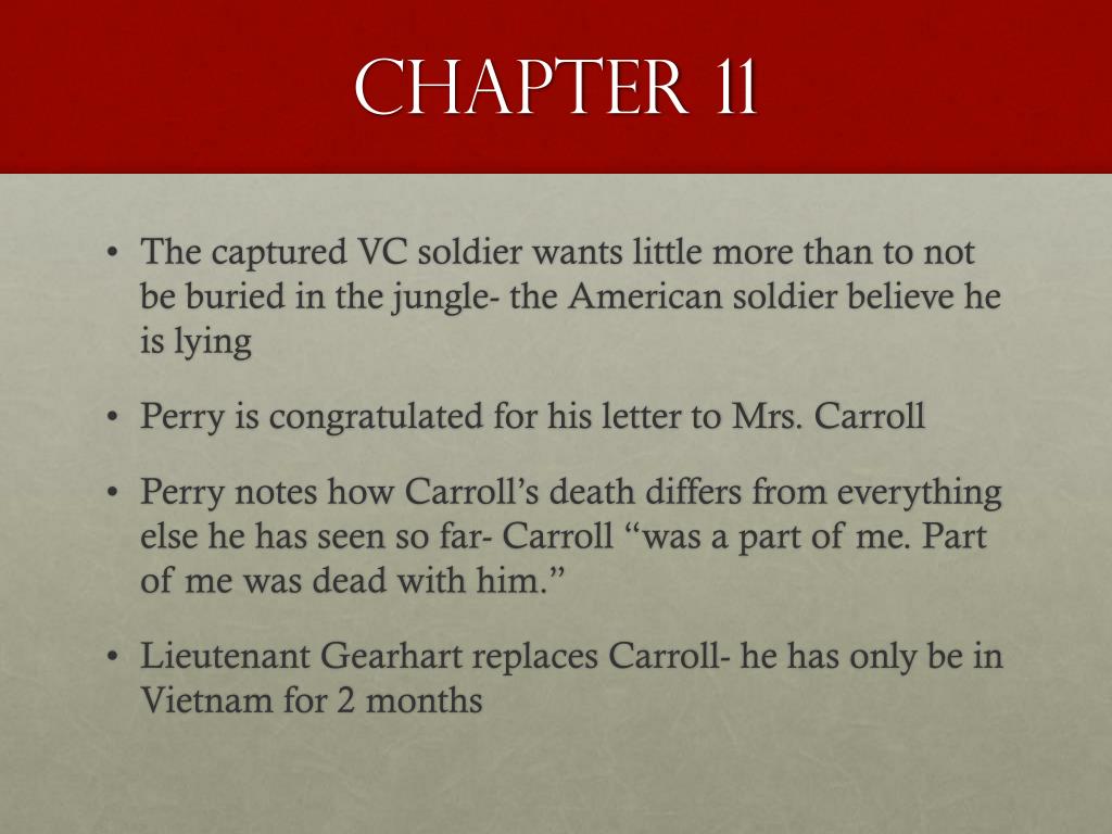 Chapter 11 • The captured VC soldier wants little more than to not be buried in the jungle- the American soldier believe he is lying • Perry is congratulated for his letter to Mrs. Carroll • Perry notes how Carroll’s death differs from everything else he has seen so far- Carroll “was a part of me. Part of me was dead with him.” • Lieutenant Gearhart replaces Carroll- he has only be in Vietnam for 2 months