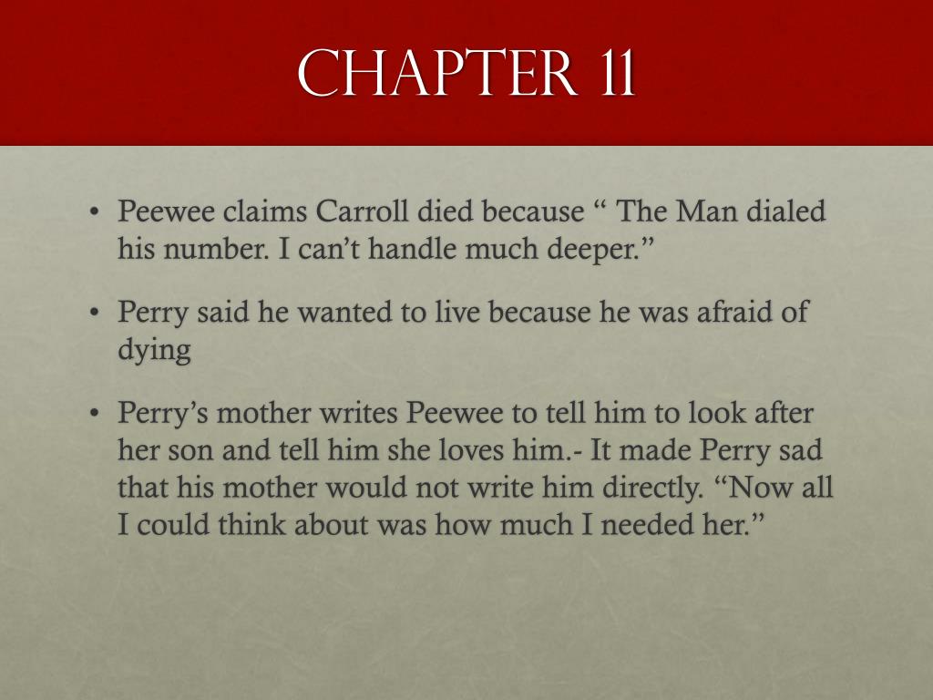 Chapter 11 • Peewee claims Carroll died because “ The Man dialed his number. I can’t handle much deeper.” • Perry said he wanted to live because he was afraid of dying • Perry’s mother writes Peewee to tell him to look after her son and tell him she loves him.- It made Perry sad that his mother would not write him directly. “Now all I could think about was how much I needed her.”