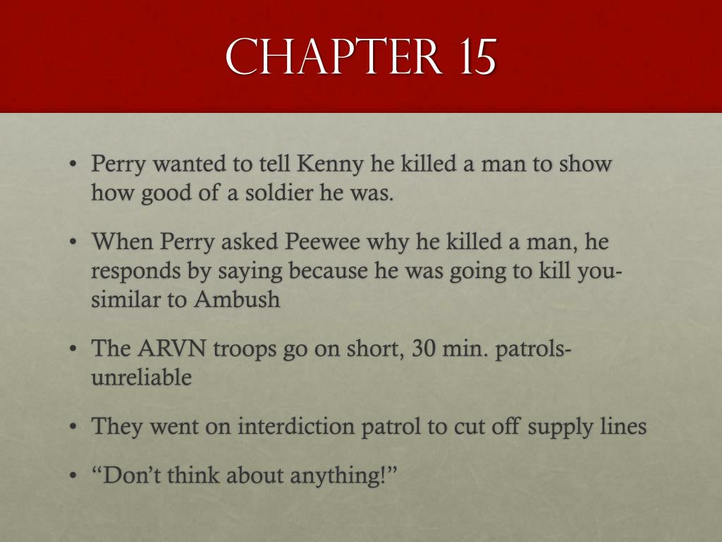 Chapter 15 • Perry wanted to tell Kenny he killed a man to show how good of a soldier he was. • When Perry asked Peewee why he killed a man, he responds by saying because he was going to kill you- similar to Ambush • The ARVN troops go on short, 30 min. patrols- unreliable • They went on interdiction patrol to cut off supply lines • “Don’t think about anything!”