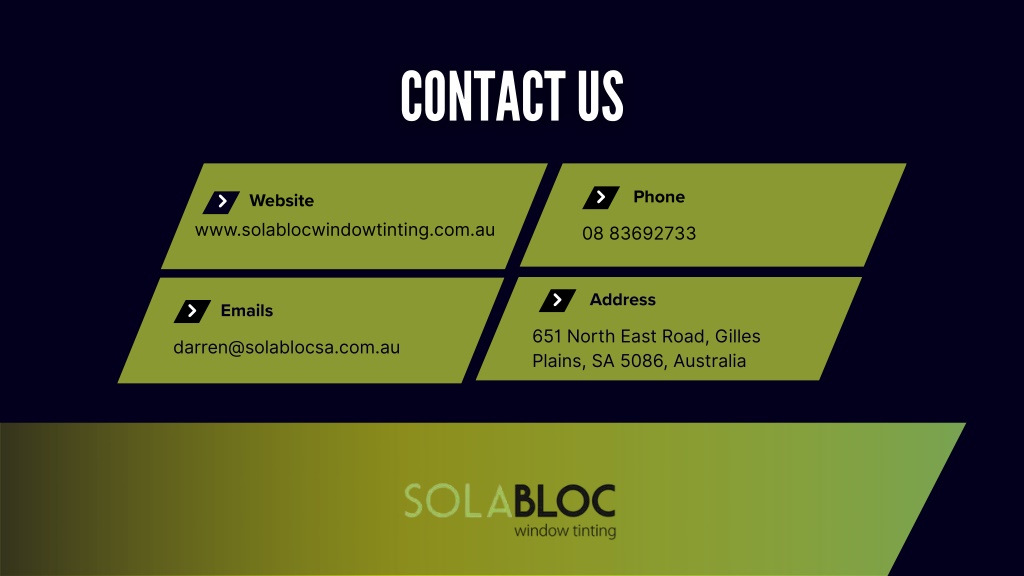 6. CONTACT US Phone Website www.solablocwindowtinting.com.au 08 83692733 Address Emails 651 North East Road, Gilles Plains, SA 5086, Australia darren@solablocsa.com.au