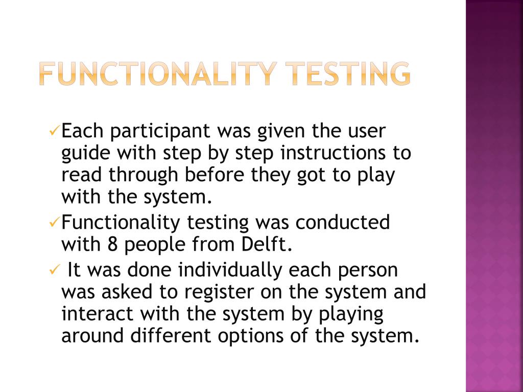 Functionality testing • Each participant was given the user guide with step by step instructions to read through before they got to play with the system. • Functionality testing was conducted with 8 people from Delft. • It was done individually each person was asked to register on the system and interact with the system by playing around different options of the system.