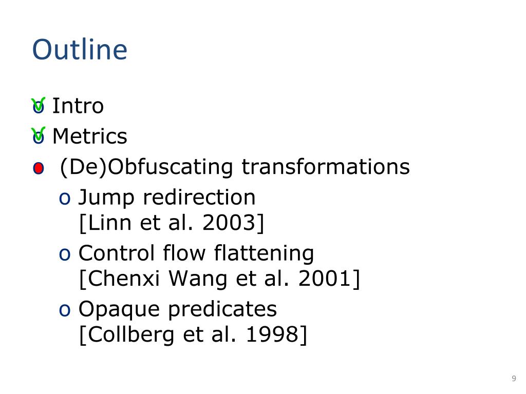 Outline • Intro • Metrics • (De)Obfuscating transformations • Jump redirection [Linn et al. 2003] • Control flow flattening [Chenxi Wang et al. 2001] • Opaque predicates [Collberg et al. 1998]
