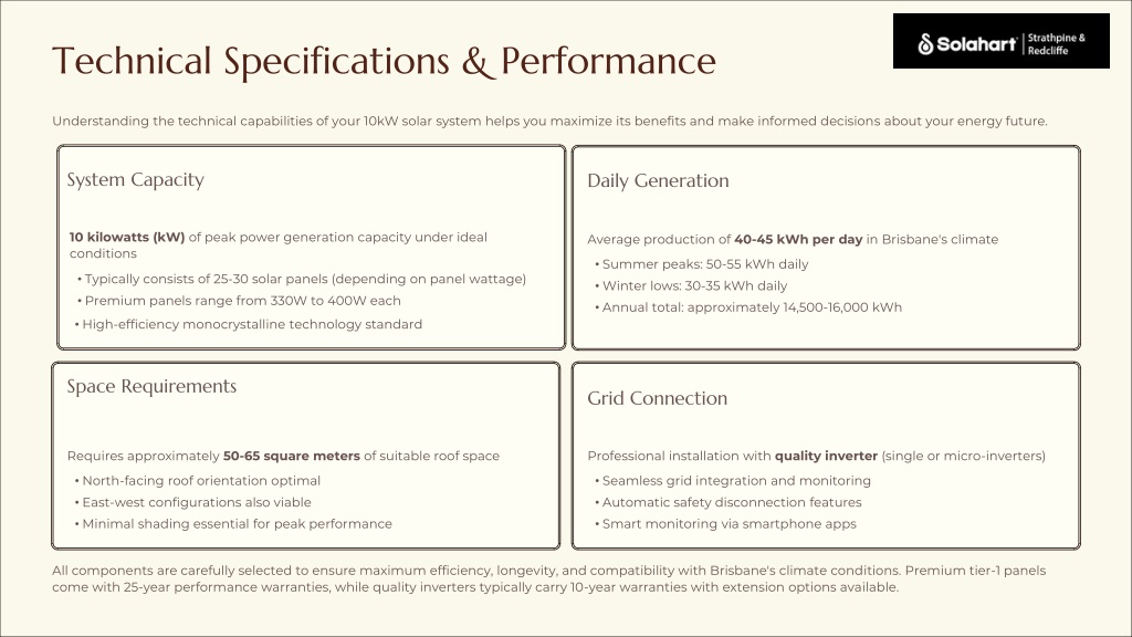 Technical Specifications & Performance Understanding the technical capabilities of your 10kW solar system helps you maximize its benefits and make informed decisions about your energy future. System Capacity Daily Generation 10 kilowatts (kW) of peak power generation capacity under ideal conditions Average production of 40-45 kWh per day in Brisbane's climate • Summer peaks: 50-55 kWh daily • Typically consists of 25-30 solar panels (depending on panel wattage) • Winter lows: 30-35 kWh daily • Premium panels range from 330W to 400W each • Annual total: approximately 14,500-16,000 kWh • High-efficiency monocrystalline technology standard Space Requirements Grid Connection Requires approximately 50-65 square meters of suitable roof space Professional installation with quality inverter (single or micro-inverters) • North-facing roof orientation optimal • Seamless grid integration and monitoring • East-west configurations also viable • Automatic safety disconnection features • Minimal shading essential for peak performance • Smart monitoring via smartphone apps All components are carefully selected to ensure maximum efficiency, longevity, and compatibility with Brisbane's climate conditions. Premium tier-1 panels come with 25-year performance warranties, while quality inverters typically carry 10-year warranties with extension options available.