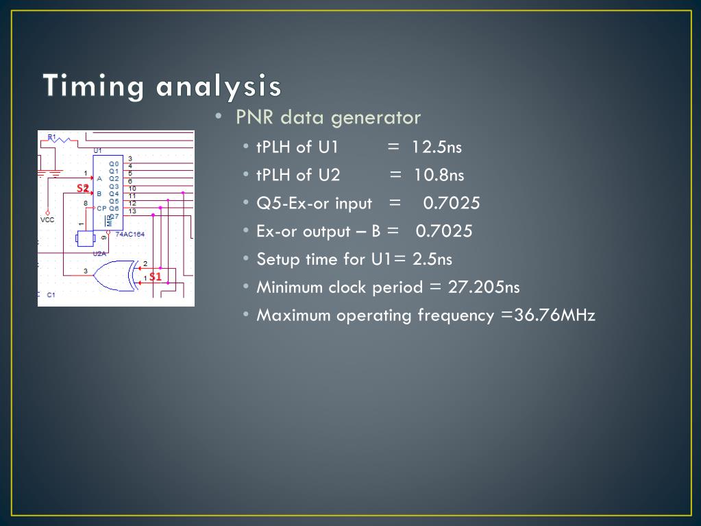 Timing analysis • PNR data generator • tPLH of U1 = 12.5ns • tPLH of U2 = 10.8ns • Q5-Ex-or input = 0.7025 • Ex-or output – B = 0.7025 • Setup time for U1= 2.5ns • Minimum clock period = 27.205ns • Maximum operating frequency =36.76MHz
