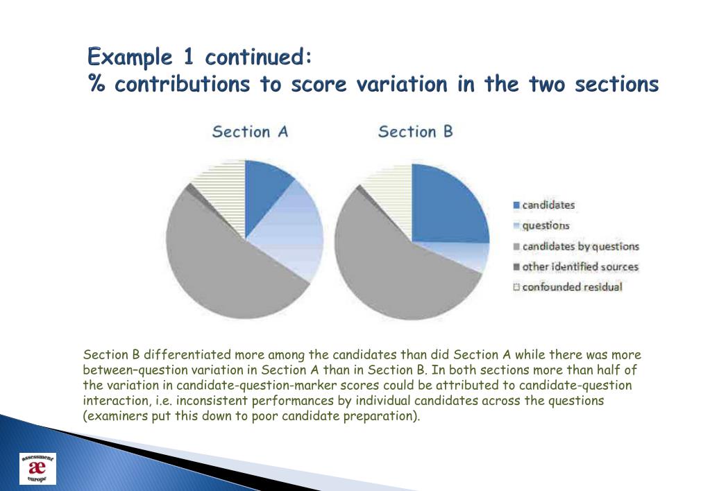 Example 1 continued: % contributions to score variation in the two sections Section B differentiated more among the candidates than did Section A while there was more between–question variation in Section A than in Section B. In both sections more than half of the variation in candidate-question-marker scores could be attributed to candidate-question interaction, i.e. inconsistent performances by individual candidates across the questions (examiners put this down to poor candidate preparation).