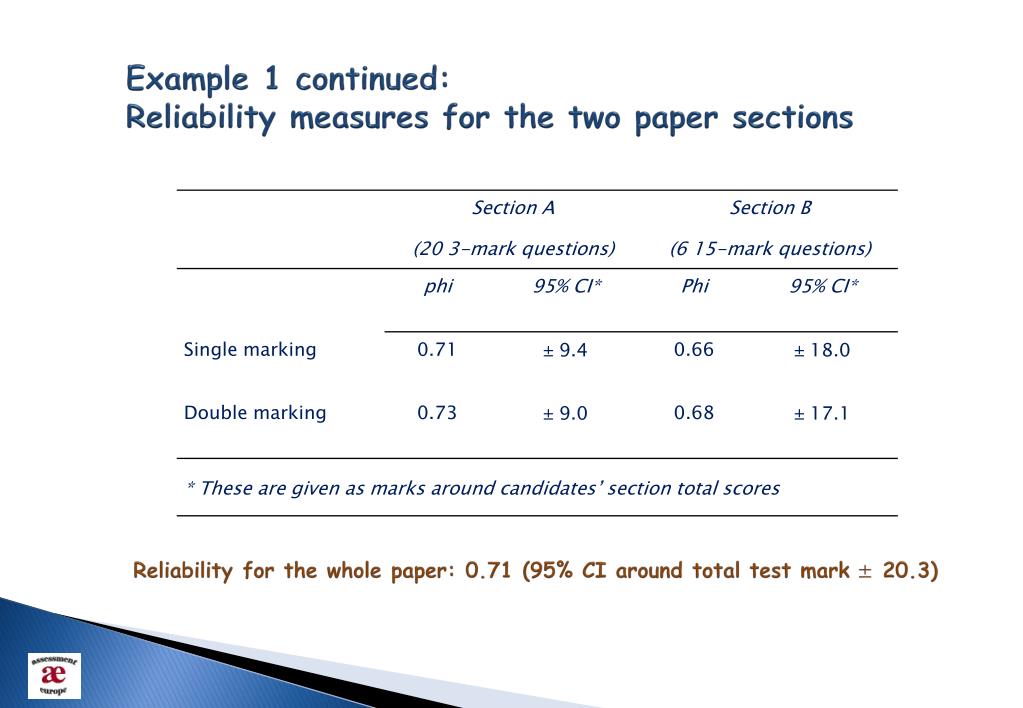 Example 1 continued: Reliability measures for the two paper sections Reliability for the whole paper: 0.71 (95% CI around total test mark ± 20.3)