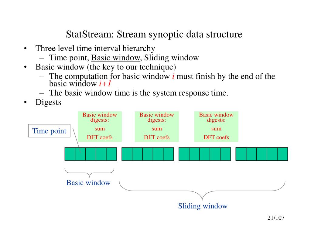 Sliding window StatStream: Stream synoptic data structure • Three level time interval hierarchy • Time point, Basic window, Sliding window • Basic window (the key to our technique) • The computation for basic window i must finish by the end of the basic window i+1 • The basic window time is the system response time. • Digests Basic window digests: sum DFT coefs Basic window digests: sum DFT coefs Basic window digests: sum DFT coefs Time point Basic window