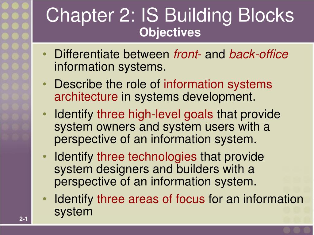 Chapter 2: IS Building Blocks Objectives. Differentiate between front - and back-office information systems. Describe the role of information systems architecture in systems development.