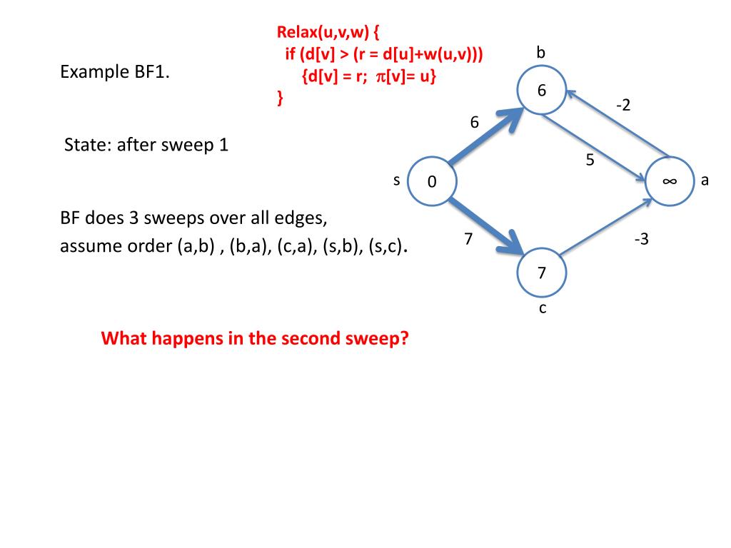 Relax(u,v,w) { if (d[v] > (r = d[u]+w(u,v))) {d[v] = r; [v]= u} } b Example BF1. State: after sweep 1 BF does 3 sweeps over all edges, assume order (a,b) , (b,a), (c,a), (s,b), (s,c). 6 -2 6 5 0 ∞ s a 7 -3 7 c What happens in the second sweep?