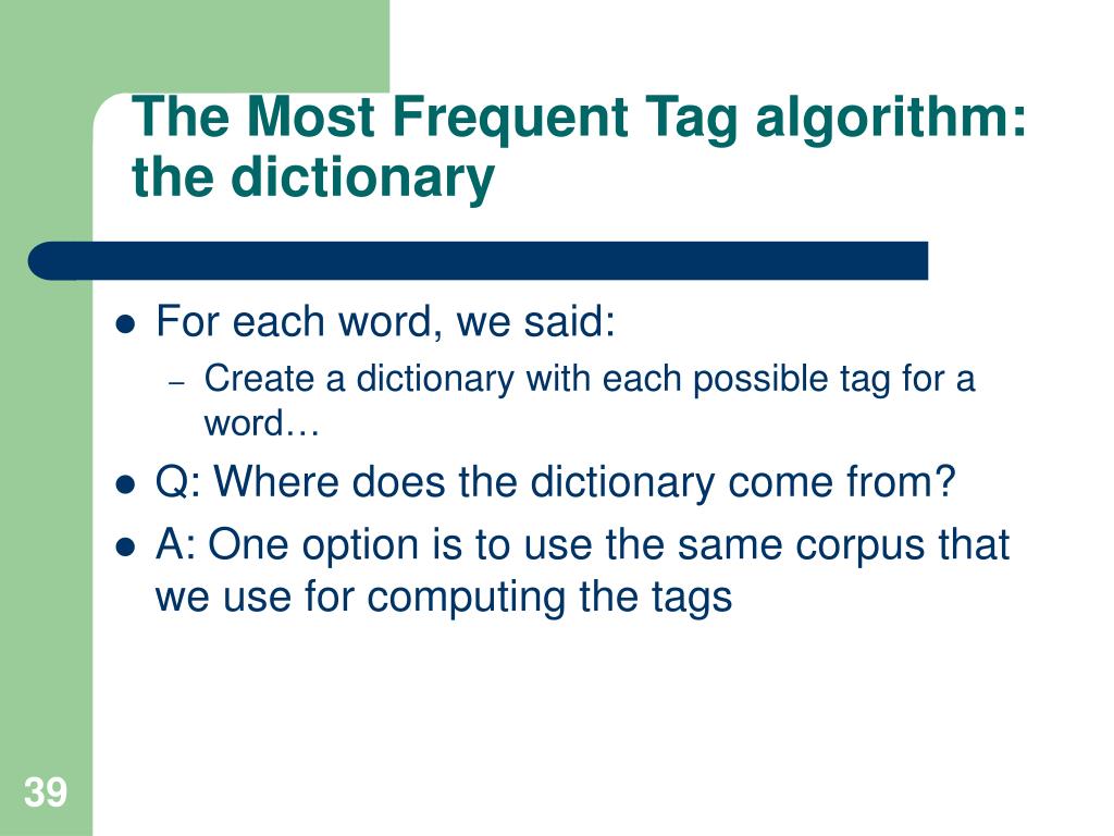 The Most Frequent Tag algorithm: the dictionary • For each word, we said: • Create a dictionary with each possible tag for a word… • Q: Where does the dictionary come from? • A: One option is to use the same corpus that we use for computing the tags