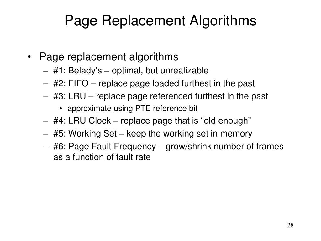 Page Replacement Algorithms • Page replacement algorithms • #1: Belady’s – optimal, but unrealizable • #2: FIFO – replace page loaded furthest in the past • #3: LRU – replace page referenced furthest in the past • approximate using PTE reference bit • #4: LRU Clock – replace page that is “old enough” • #5: Working Set – keep the working set in memory • #6: Page Fault Frequency – grow/shrink number of frames as a function of fault rate