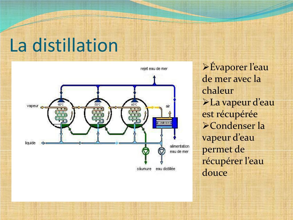 La distillation • Évaporer l’eau de mer avec la chaleur • La vapeur d’eau est récupérée • Condenser la vapeur d’eau permet de récupérer l’eau douce