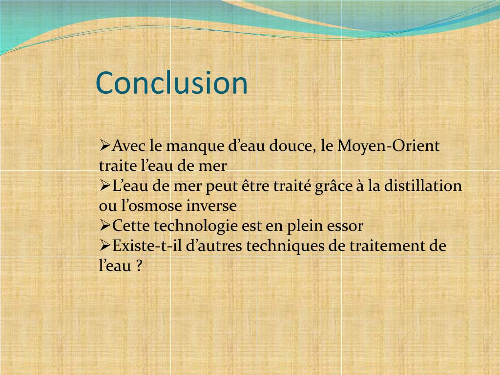 Conclusion • Avec le manque d’eau douce, le Moyen-Orient traite l’eau de mer • L’eau de mer peut être traité grâce à la distillation ou l’osmose inverse • Cette technologie est en plein essor • Existe-t-il d’autres techniques de traitement de l’eau ?