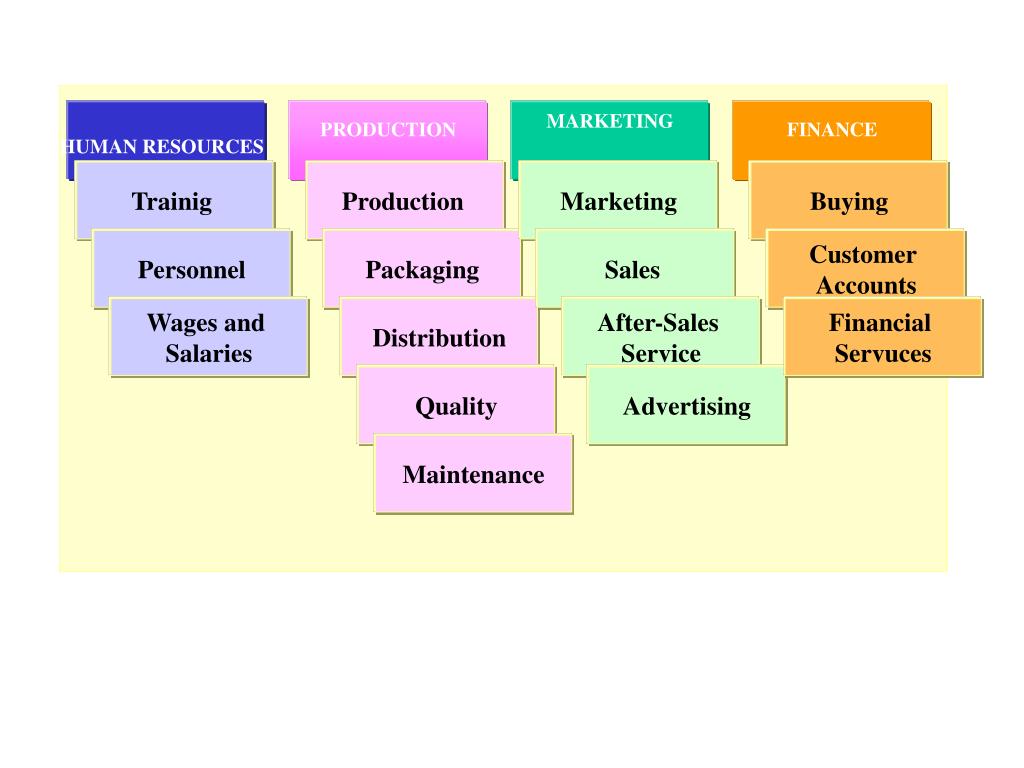 HUMAN RESOURCES PRODUCTION MARKETING FINANCE Trainig Production Marketing Buying Personnel Packaging Sales Customer Accounts Wages and Salaries Distribution After-Sales Service Financial Servuces Quality Advertising Maintenance