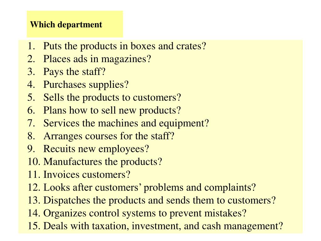 Which department • Puts the products in boxes and crates? • Places ads in magazines? • Pays the staff? • Purchases supplies? • Sells the products to customers? • Plans how to sell new products? • Services the machines and equipment? • Arranges courses for the staff? • Recuits new employees? • Manufactures the products? • Invoices customers? • Looks after customers’ problems and complaints? • Dispatches the products and sends them to customers? • Organizes control systems to prevent mistakes? • Deals with taxation, investment, and cash management?