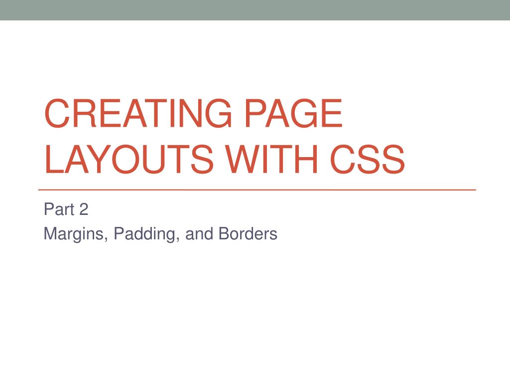 Creating Page Layouts with CSS. Part 2 Margins, Padding, and Borders. Setting Margins and Padding. Margin Styles margin-top: length; margin-right: length; margin-bottom: length; margin-left: length; Or margin: top right bottom left;
