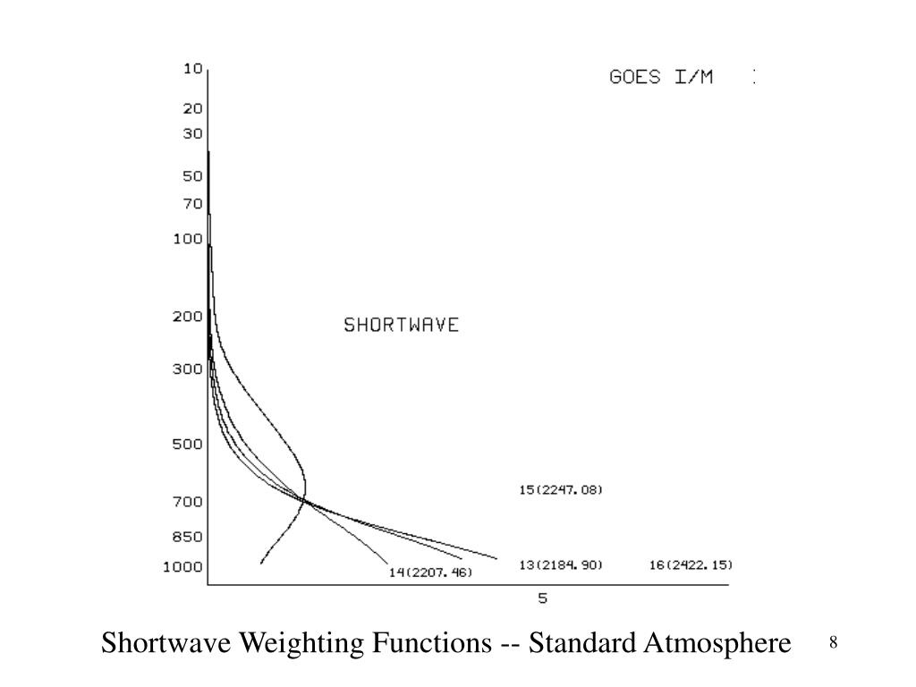 GOES Sounder Band Central Frequency Some Uses 1 14.7 Retrieval, Ozone 2 14.4 Retrieval, Ozone 3 14.0 Retrieval, Ozone, Clouds 4 13.7 Retrieval, Ozone, Clouds 5 13.4 Retrieval, Clouds, Cloud-Clearing 6 12.7 Retrieval, Clouds 7 12.0 Retrieval, Clouds, Cloud-Clearing 8 11.0 Retrieval, Winds, Clouds, Snow, Cloud-Clearing 9 9.7 Ozone 10 7.5 Retrieval, Winds 11 7.0 Retrieval, Winds 12 6.5 Retrieval, Ozone 13 4.6 Retrieval, Ozone 14 4.5 Retrieval, Ozone 15 4.4 Retrieval, Ozone 16 4.1 Retrieval, Ozone, Snow 17 4.0 Snow, Cloud-Clearing 18 3.8 Snow