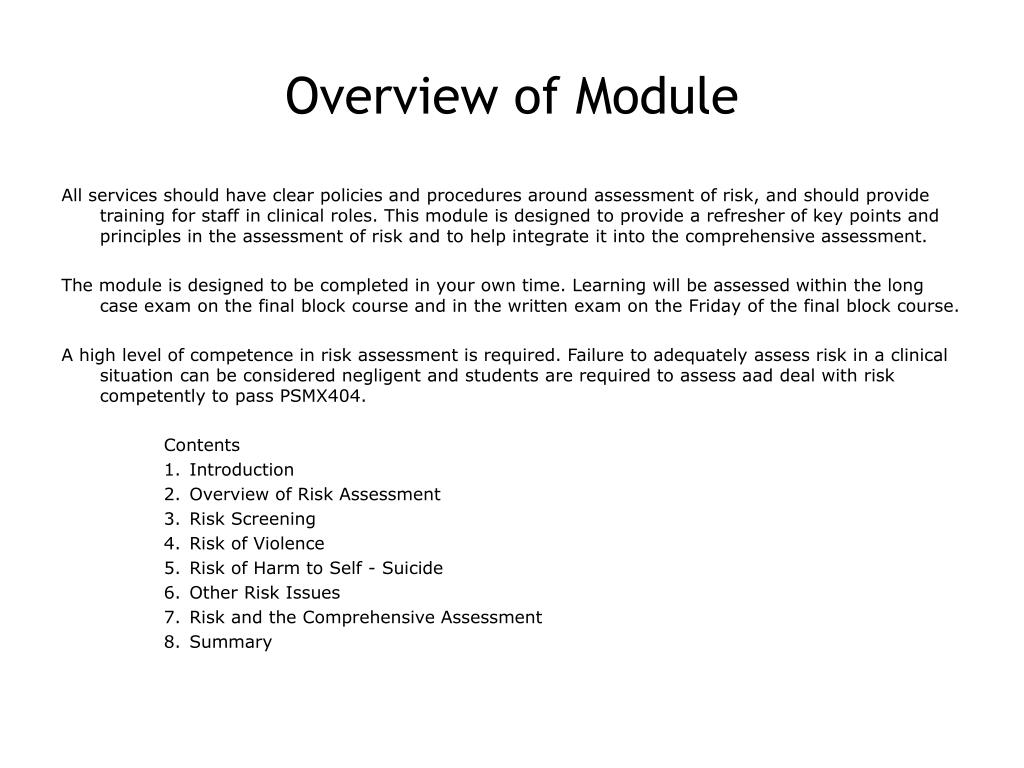 Overview of Module All services should have clear policies and procedures around assessment of risk, and should provide training for staff in clinical roles. This module is designed to provide a refresher of key points and principles in the assessment of risk and to help integrate it into the comprehensive assessment. The module is designed to be completed in your own time. Learning will be assessed within the long case exam on the final block course and in the written exam on the Friday of the final block course. A high level of competence in risk assessment is required. Failure to adequately assess risk in a clinical situation can be considered negligent and students are required to assess aad deal with risk competently to pass PSMX404. Contents • Introduction • Overview of Risk Assessment • Risk Screening • Risk of Violence • Risk of Harm to Self - Suicide • Other Risk Issues • Risk and the Comprehensive Assessment • Summary