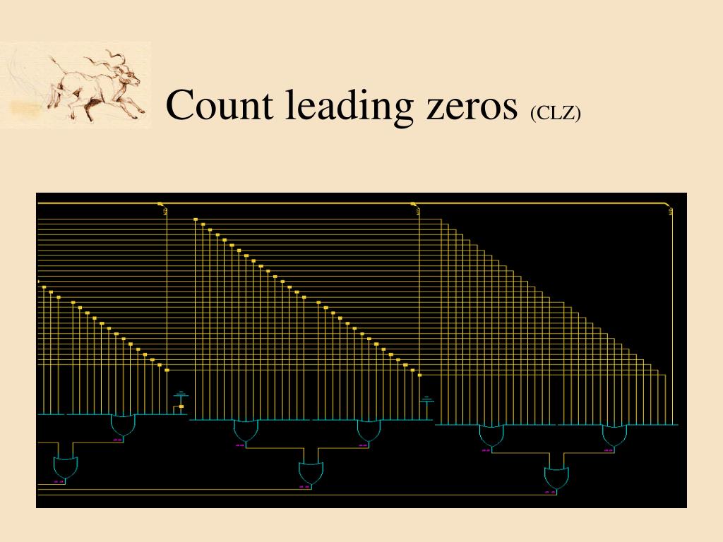 CLZ Timing • Time equals: • 2x 16-bit OR gate • 1x 2-bit OR gate • 1x 2-bit XOR gate • Perhaps faster than an addition!