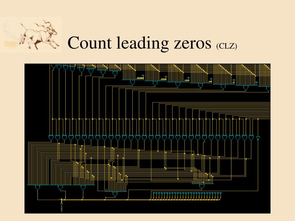 Count leading zeros (CLZ) • Output equals number of leading zeros on the input (Ex: 00010110 00000011) • First step: 00010110 00011111 • Then, add one: 00011111 00100000 • Lastly, convert to binary. With a 32-bit input, output will have a 6-digit maximum.